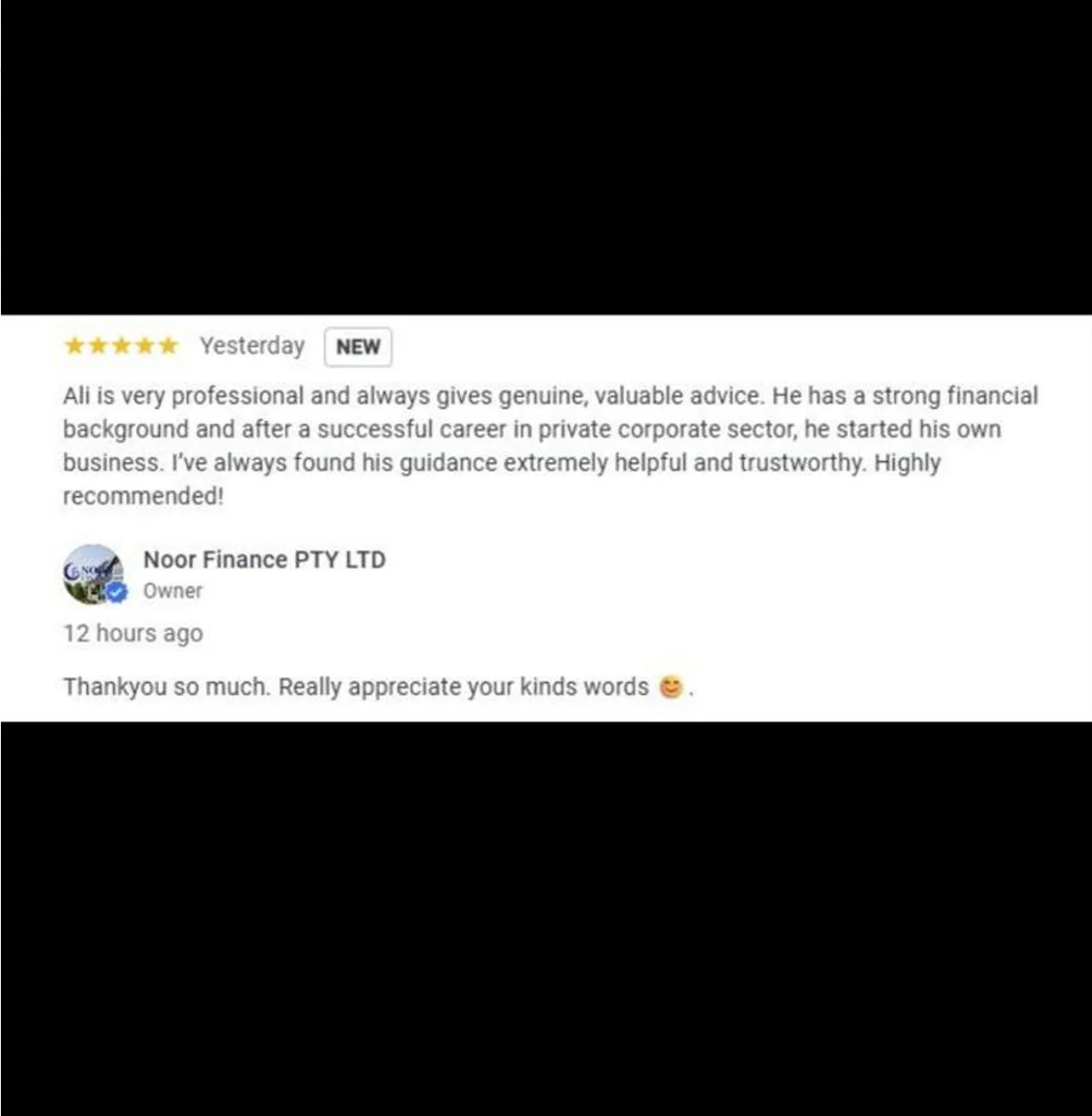 Mohsin Mirza2025-05-31Trustindex verifies that the original source of the review is Google. We had the pleasure of dealing with Mr. Ali, and was quite impressed with the market updates he has been providing to us. Very informative and knowledgeable! We would highly recommend Mr. Ali to anyone looking for a knowledgeable and reliable mortgage broker. Salik Humayun2025-05-30Trustindex verifies that the original source of the review is Google. Ali is an outstanding mortgage broker! Highly recommend for anyone looking for expert, responsive and friendly service! Zohaib Khawaja2025-05-28Trustindex verifies that the original source of the review is Google. I highly recommend Mr. Ali for anyone looking for mortgage services in Australia. He is honest, responsive, and deeply knowledgeable. I felt confident and informed throughout the entire process. Noor Finance is definitely a name you can trust. Shah Malik2025-05-27Trustindex verifies that the original source of the review is Google. I had the privilege to work with Noor Finance, I found the team very empathetic and human centred, while maintaining high levels of professionalism. They are experts on mortgage subject matter and general finance solutions especially Ali Mehboob who guided me and kept me updated with news and latest developments in this sector. I fully endorse and recommend Noor Finance for your mortgage & financial solutions. Nadeem Butt2025-05-26Trustindex verifies that the original source of the review is Google. Ali Bhai is the best finance broker available in Sydney. Malik Saad2025-05-26Trustindex verifies that the original source of the review is Google. Ali supported us all the way, getting on the property ladder was made easy and was broken down to give us confidence to buy, extremely pleased with the rate thanks a million. Hope to do business again Waheed Qureshi2025-05-26Trustindex verifies that the original source of the review is Google. I recently had the pleasure of working with Noor Finance to refinance my loan, and I couldn't be more impressed! Their team was extremely professional, knowledgeable, and always available to answer my questions. The process was seamless and stress-free, thanks to their expertise and guidance. I'd highly recommend Noor Finance to anyone looking to refinance their current loan or navigate the process of buying their first home.Verified by TrustindexTrustindex verified badge is the Universal Symbol of Trust. Only the greatest companies can get the verified badge who has a review score above 4.5, based on customer reviews over the past 12 months. Read more